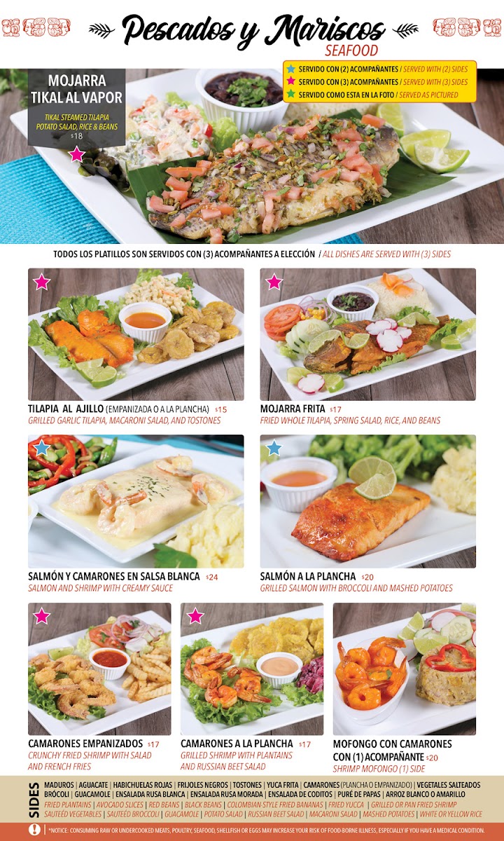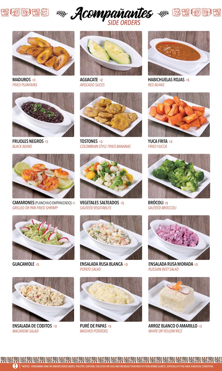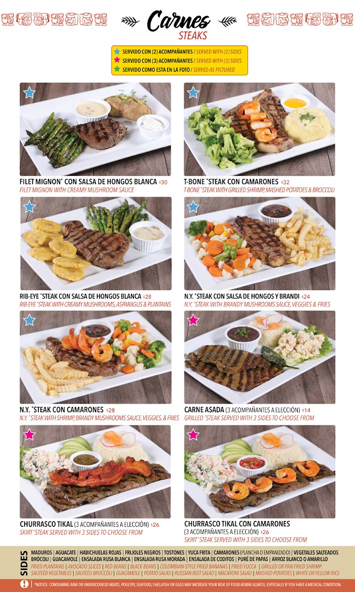 * Servido con (2) acompañantes / served with (2) sides * Servido con (3) acompañanes / Served with (3) sides * Servido como esta en la foto / served as picture
