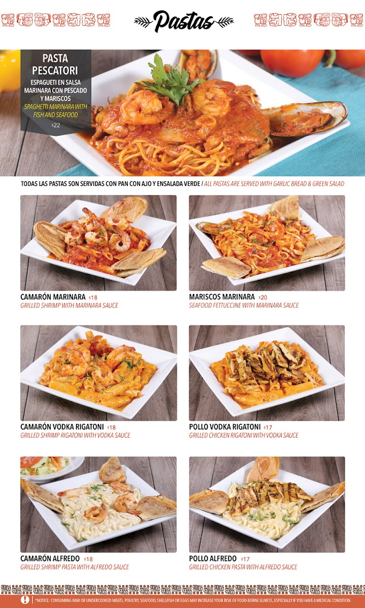 Todas las pastas son servidas con pan con ajo y ensalada verde. | All pastas are served with garlic bread & green salad